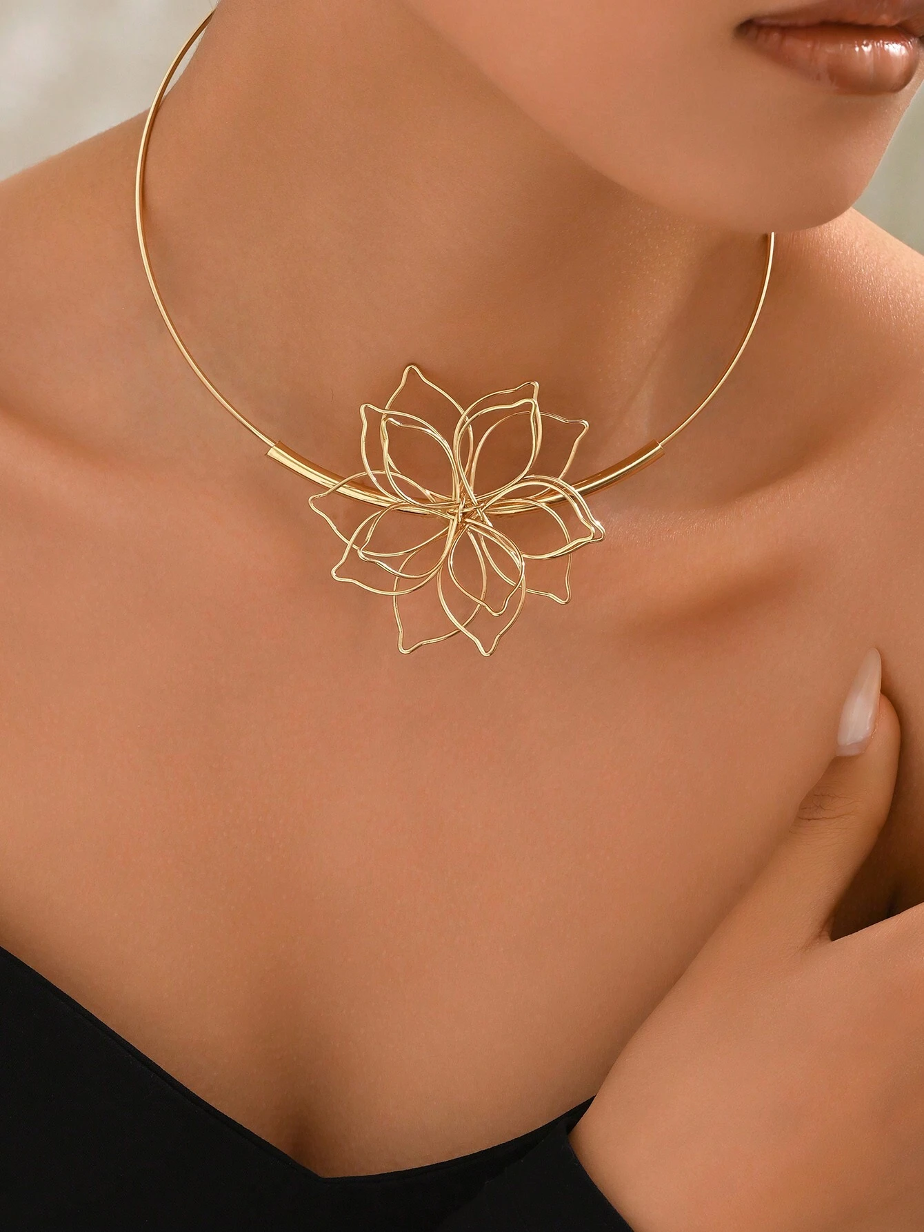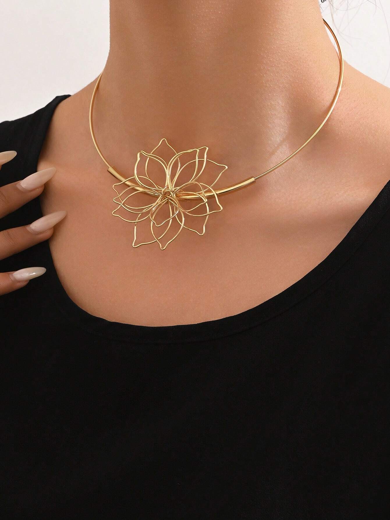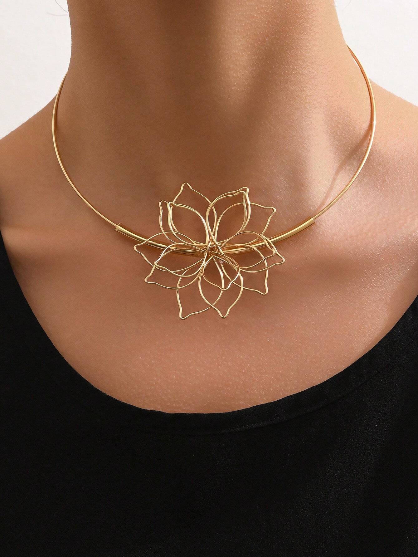 Colar Choker de Metal Dourado com Decoração de Flores Estilo Europeu e Americano