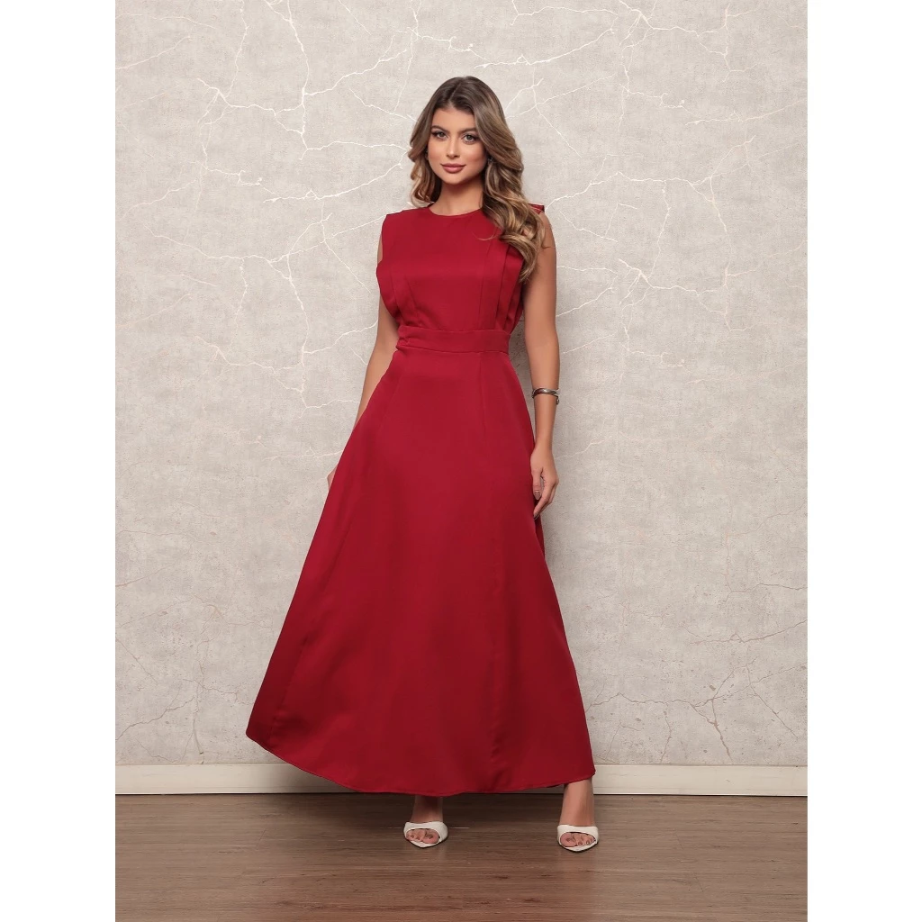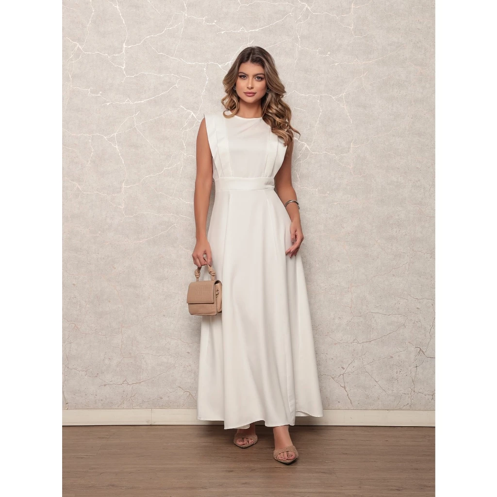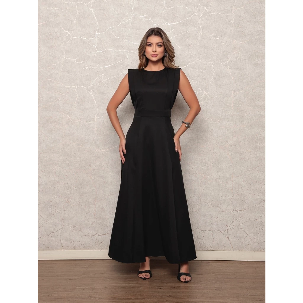 Vestido social liso, tecido em alfaiataria sem manga.